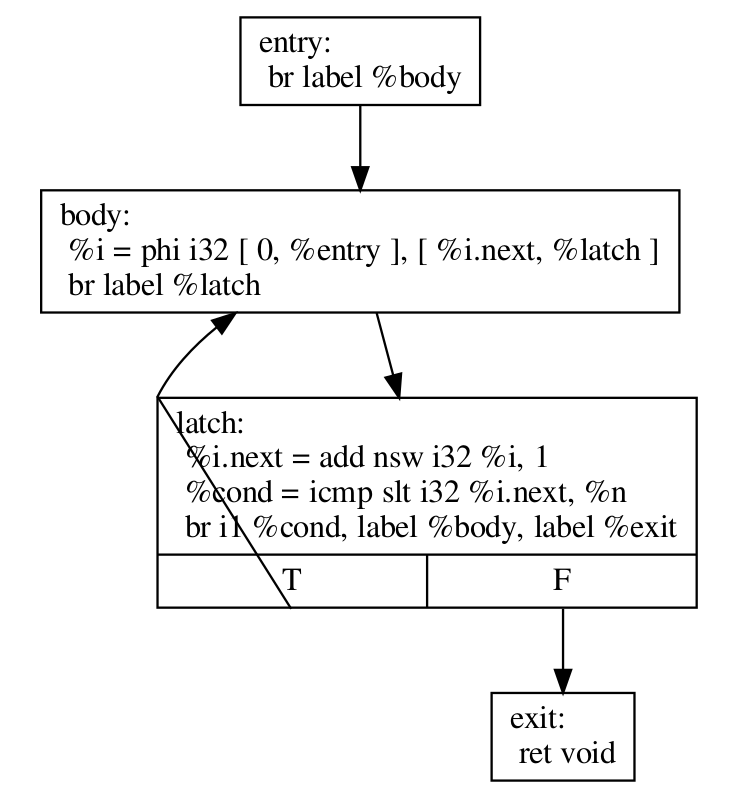 • The smallest loop consists of a single basic block that branches to itself. In this case that block is the header, latch (and exiting block if it has another edge to a different block) at the same time. A single block that has no branch to itself is not considered a loop, even though it is trivially strongly connected.